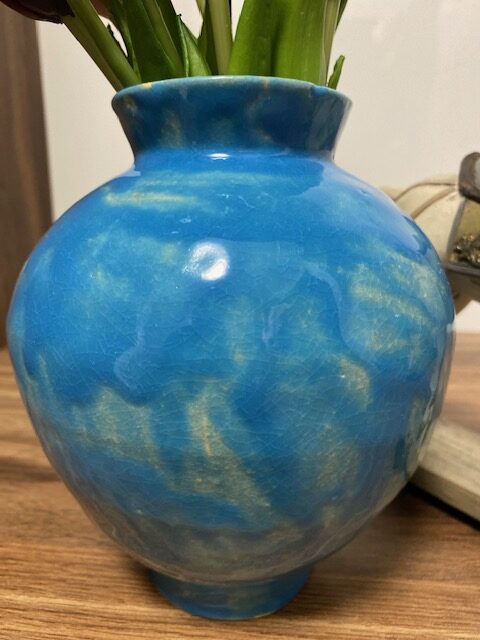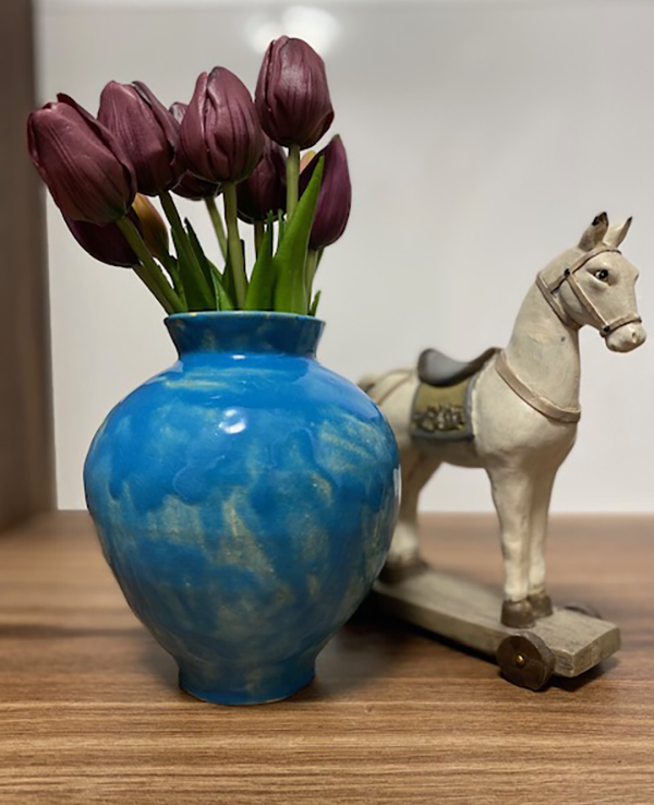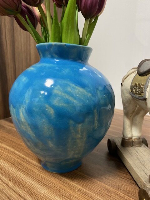 Táto nádherná ručne robená váza je pravým skvostom pre milovníkov keramiky a jedinečného dizajnu. Svojou živou tyrkysovou farbou a elegantným tvarom pridáva štýl a sviežosť do akéhokoľvek priestoru.