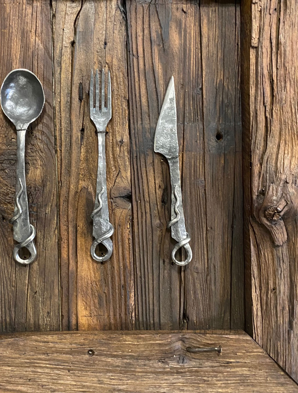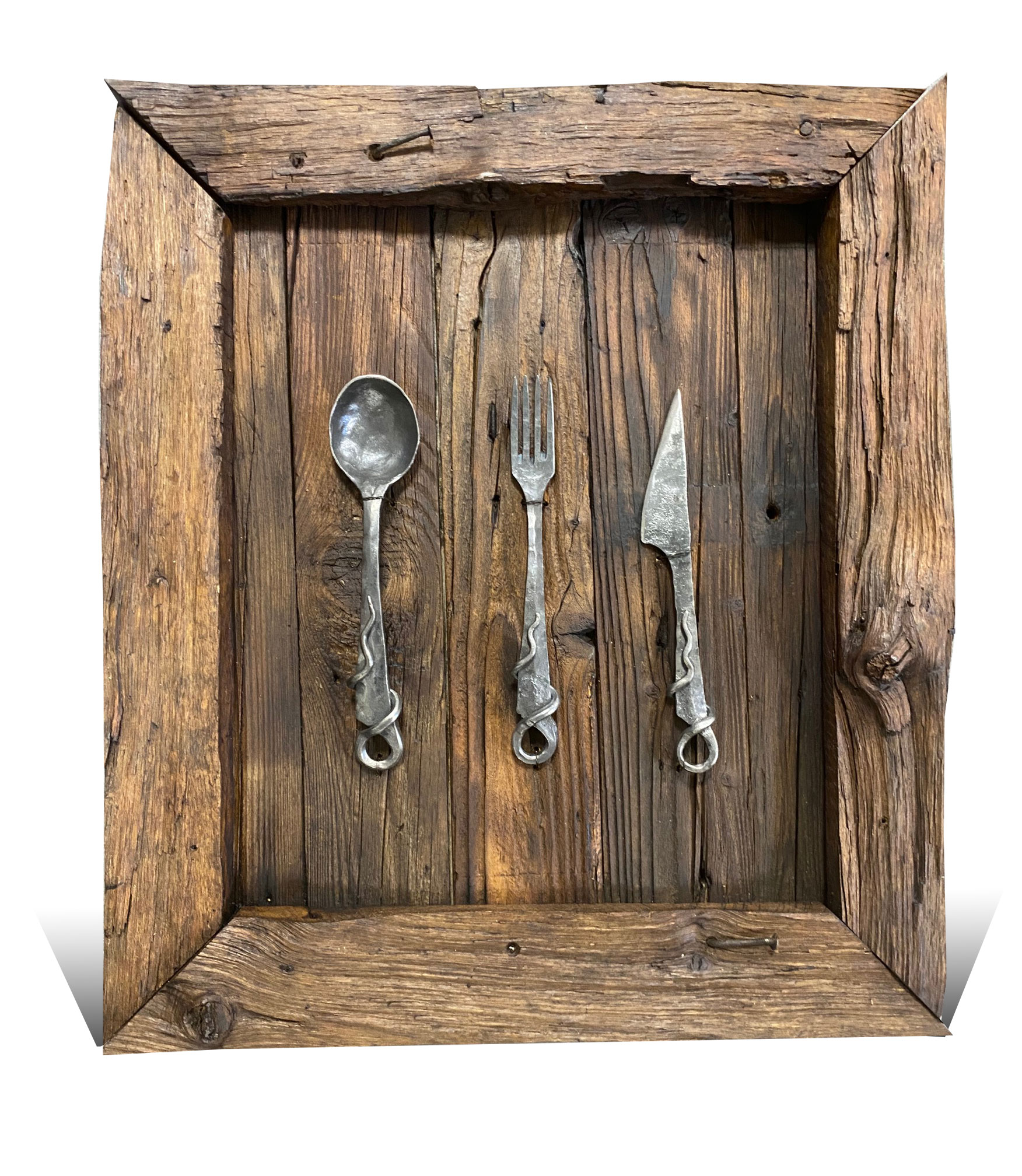 Drevený obraz vyrobený zo 100 ročného dreva namorený proti červotočom a ošetrený včelím voskom. Príbor je ručne ukovaný a ochránený voskom proti hrdzi. Každý kus sa môže líšiť a obrázok má informačný charakter pretože nie je možné aby každé drevo bolo rovnaké. Takže budete vlastniť originál , ktorý nemá okrem Vás nikto. Je to štýlový doplnok do domu, chaty alebo len ako úžasný darček.