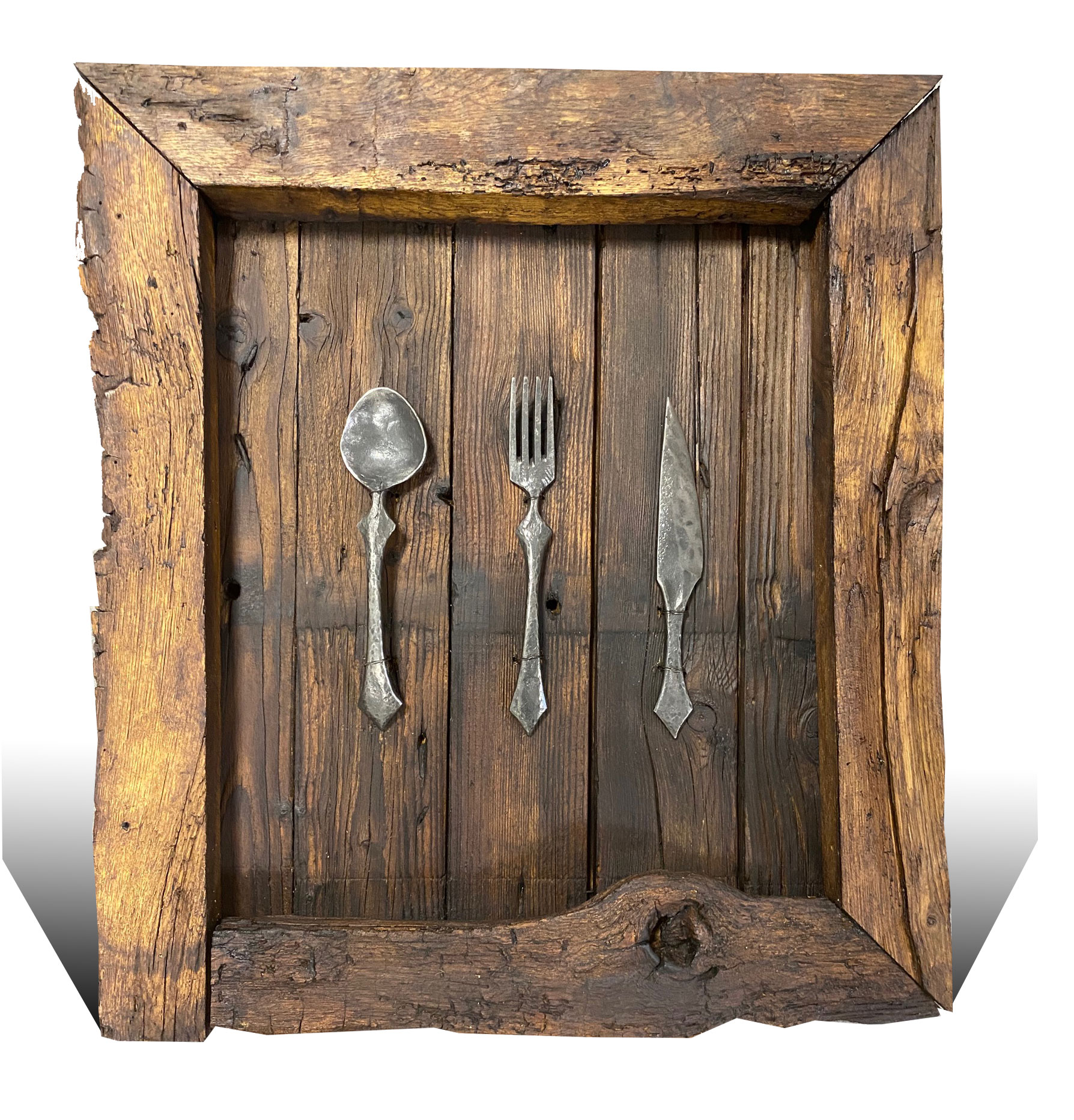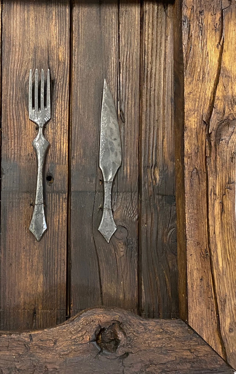 Drevený obraz vyrobený zo 100 ročného dreva namorený proti červotočom a ošetrený včelím voskom. Príbor je ručne ukovaný a ochránený voskom proti hrdzi. Každý kus sa môže líšiť a obrázok má informačný charakter pretože nie je možné aby každé drevo bolo rovnaké. Takže budete vlastniť originál , ktorý nemá okrem Vás nikto. Je to štýlový doplnok do domu, chaty alebo len ako úžasný darček.