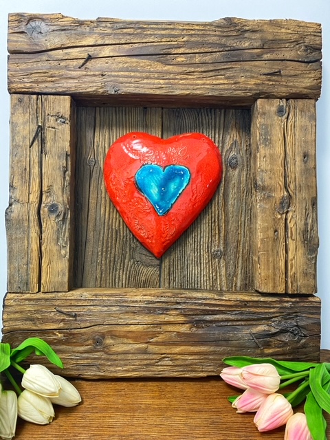 Drevený obraz vyrobený zo 100 ročného dreva namorený proti červotočom a ošetrený včelím voskom. Srdcia sú ručná keramická práca . Každý kus sa môže líšiť a obrázok má informačný charakter pretože nie je možné aby každé drevo bolo rovnaké. Takže budete vlastniť originál , ktorý nemá okrem Vás nikto. Je to štýlový doplnok do domu, chaty alebo len ako úžasný darček.
