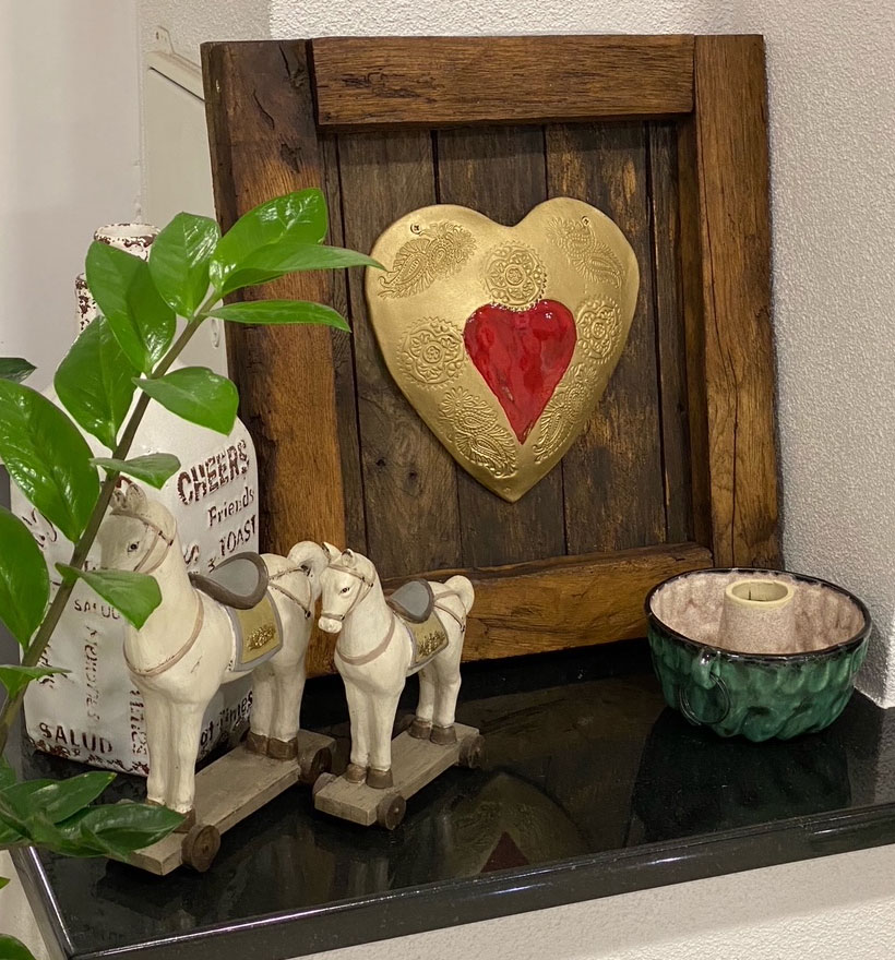 Drevený obraz vyrobený zo 100 ročného dreva namorený proti červotočom a ošetrený včelím voskom. Srdce je ručná keramická práca . Každý kus sa môže líšiť a obrázok má informačný charakter pretože nie je možné aby každé drevo bolo rovnaké. Takže budete vlastniť originál , ktorý nemá okrem Vás nikto. Je to štýlový doplnok do domu, chaty alebo len ako úžasný darček.