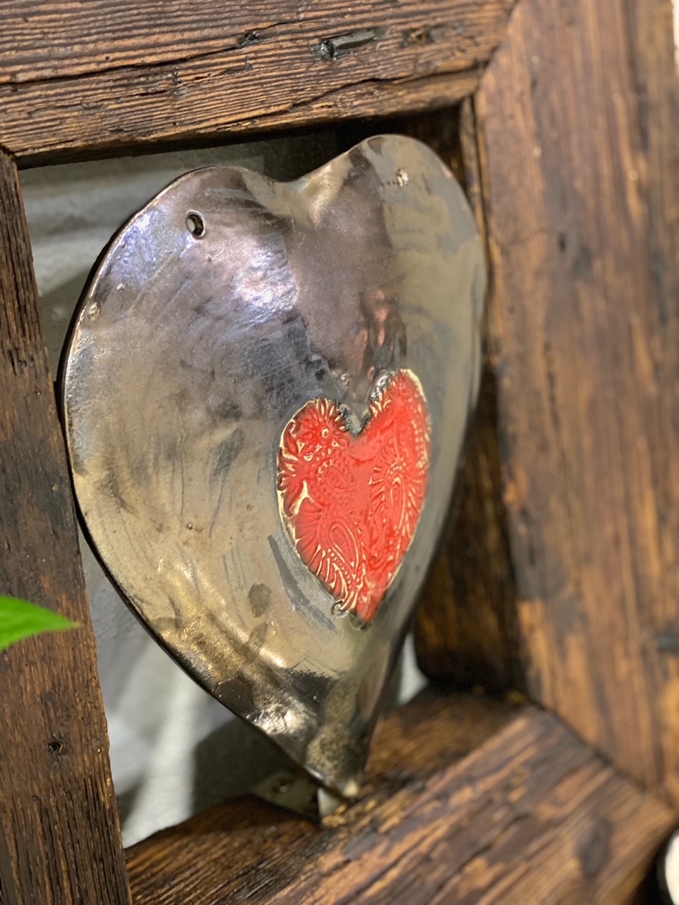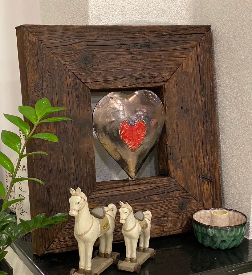 Drevený obraz vyrobený zo 100 ročného dreva namorený proti červotočom a ošetrený včelím voskom. Srdce je ručná keramická práca . Každý kus sa môže líšiť a obrázok má informačný charakter pretože nie je možné aby každé drevo bolo rovnaké. Takže budete vlastniť originál , ktorý nemá okrem Vás nikto. Je to štýlový doplnok do domu, chaty alebo len ako úžasný darček.