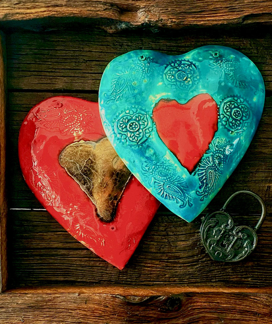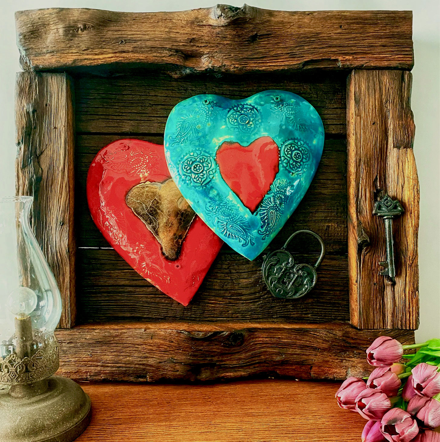 Drevený obraz vyrobený zo 100 ročného dreva namorený proti červotočom a ošetrený včelím voskom. Srdcia sú ručná keramická práca . Každý kus sa môže líšiť a obrázok má informačný charakter pretože nie je možné aby každé drevo bolo rovnaké. Takže budete vlastniť originál , ktorý nemá okrem Vás nikto. Je to štýlový doplnok do domu, chaty alebo len ako úžasný darček.
