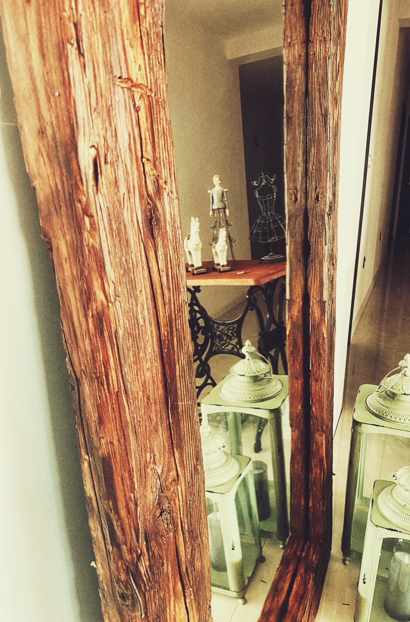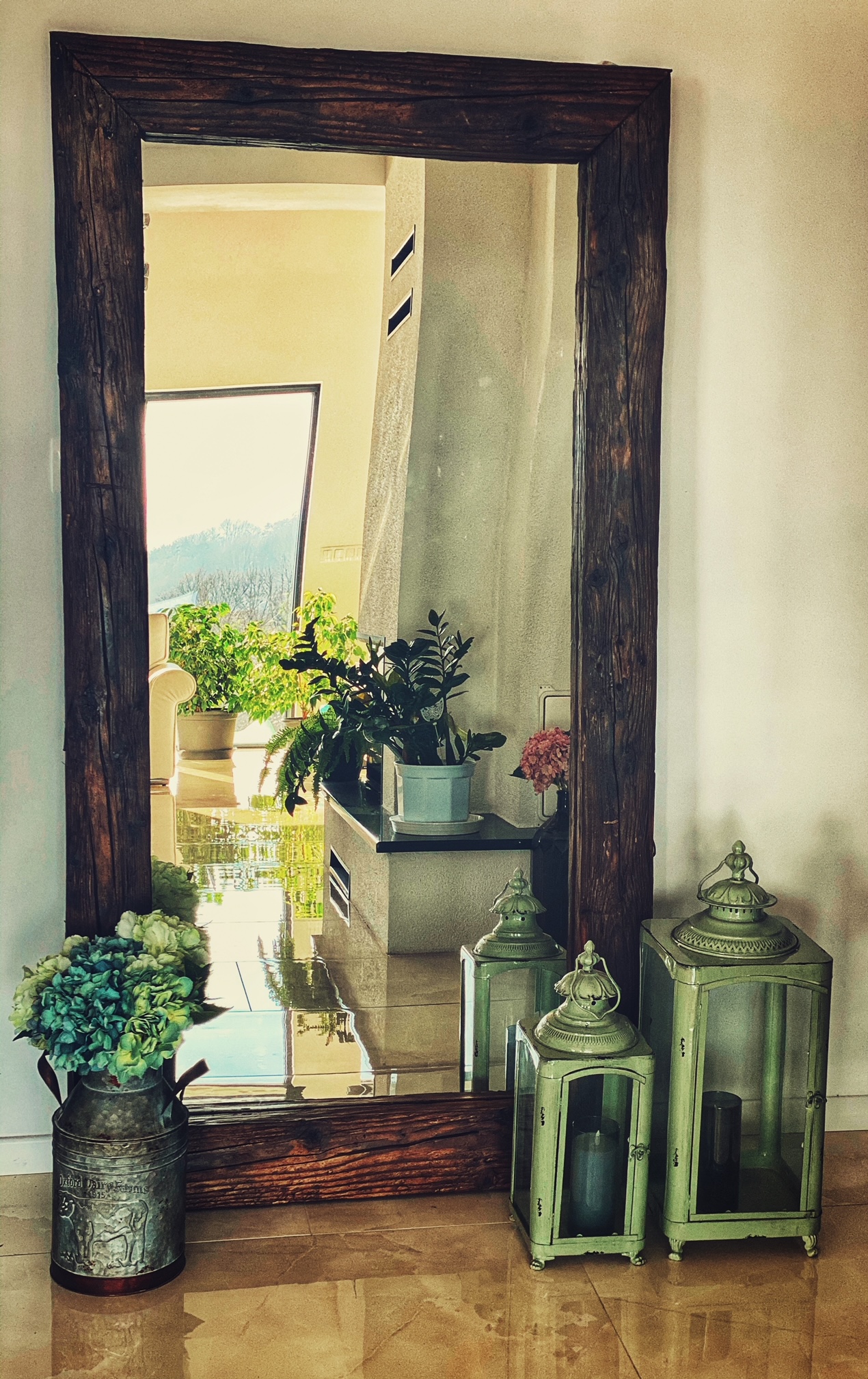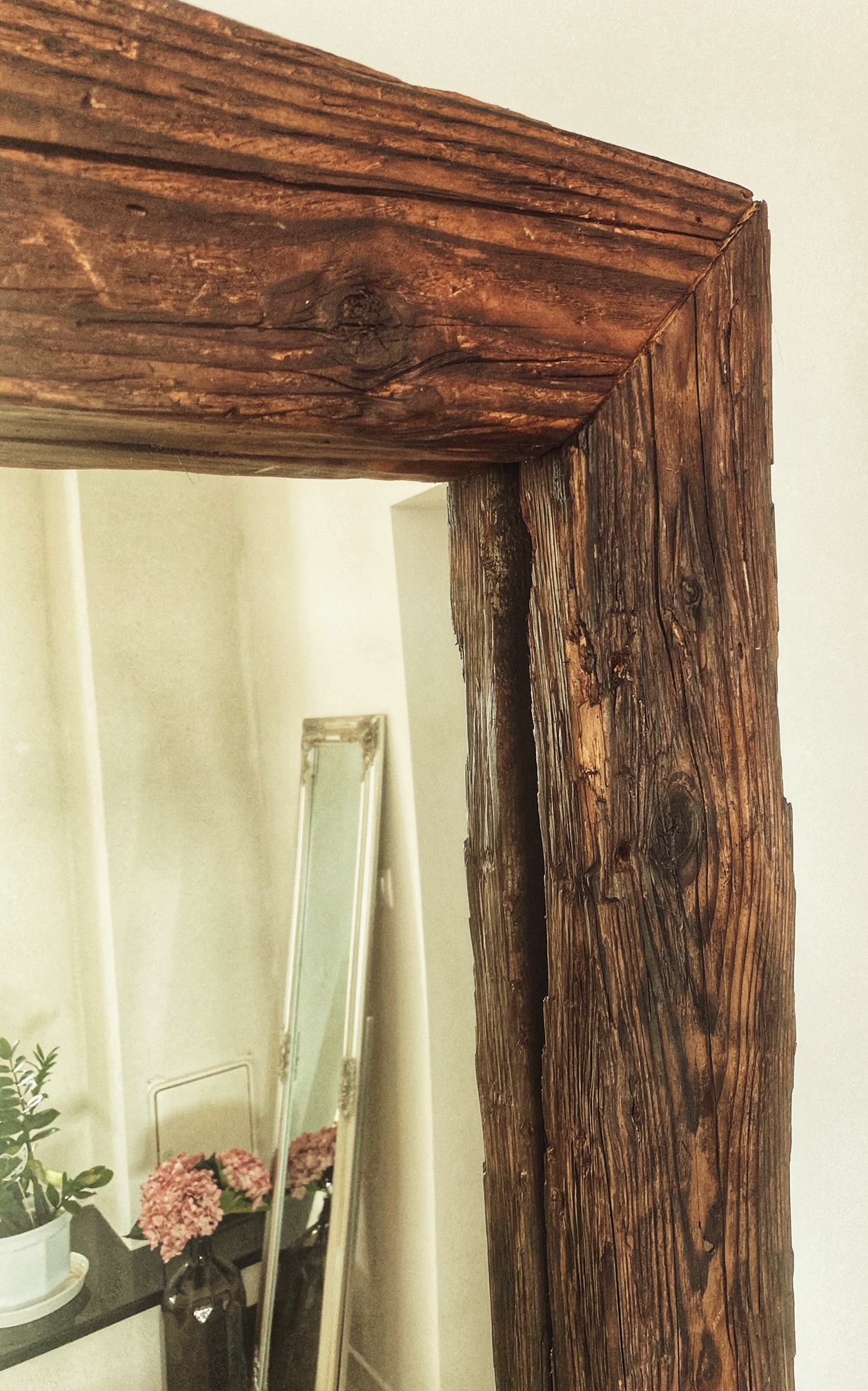 Ručne kresané 75- ročné drevo zo starej stodoly ošetrené včelím voskom proti červotočom. zrkadlo ochránené zo zadnej strany špecialnou fóliou proti rozbitiu.